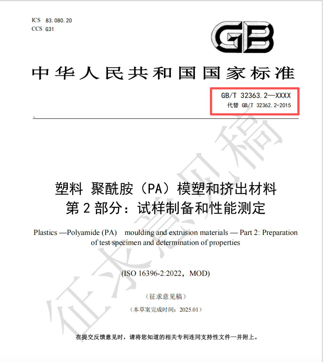 ● GB/T 32363.2:《聚酰胺(PA)模塑和挤出材料试样制备与性能测定 第2部分:PA6 与 PA66》正在修订。